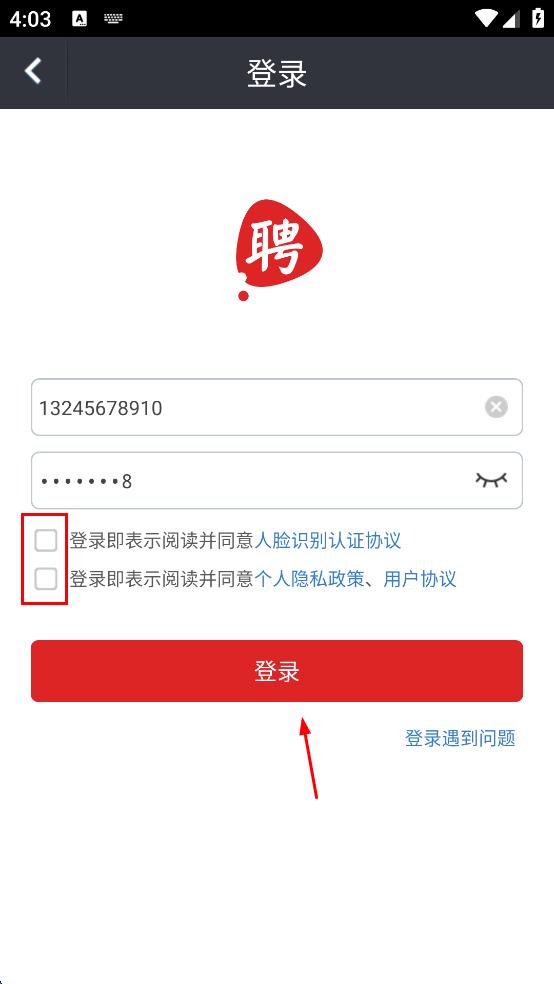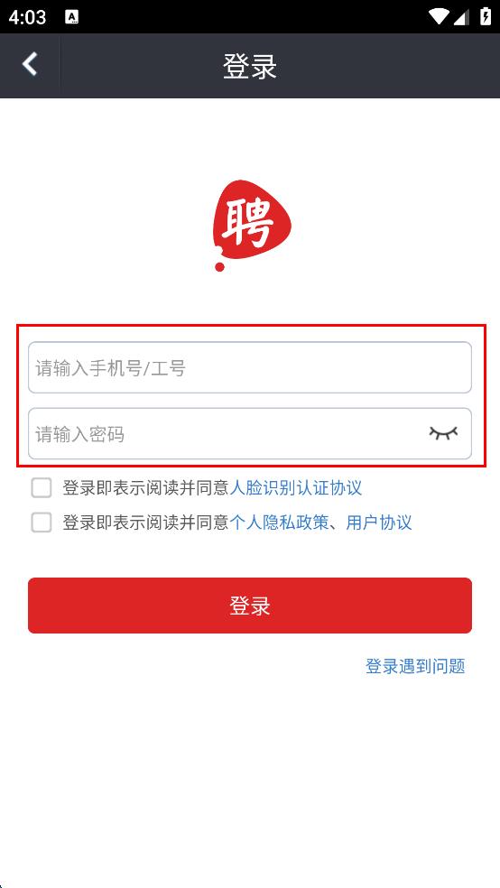 4、確認(rèn)手機(jī)號(hào)/工號(hào)和密碼輸入無誤,且勾選登錄即表示閱讀并同意人臉識(shí)別認(rèn)證協(xié)議、個(gè)人隱私政策、用戶協(xié)議后,點(diǎn)擊登錄按鈕,即可完成富士康招聘類APP的登錄操作。