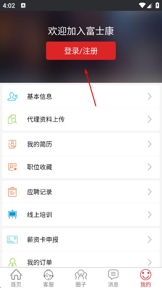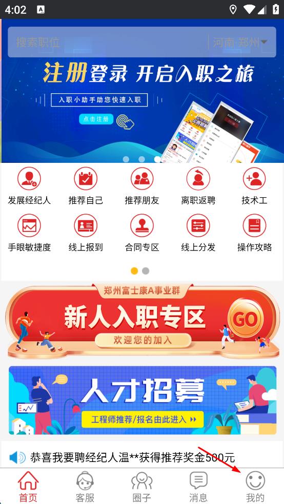 1、打開富士康招聘類APP,進(jìn)入首頁后,能看到各類入職相關(guān)功能入口和推薦內(nèi)容,點(diǎn)擊頁面右下角“我的”選項(xiàng),進(jìn)入個(gè)人中心頁面。