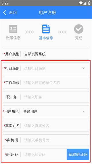 2、進(jìn)入基本信息頁(yè)面,選擇用戶類別,如自然資源系統(tǒng)。