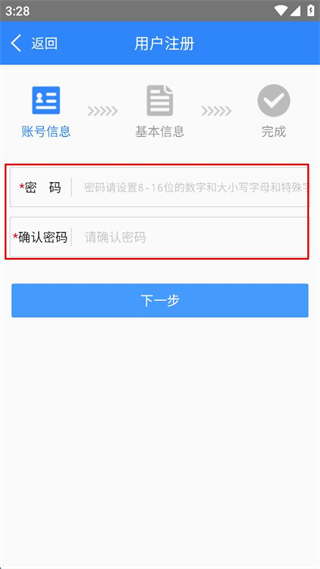 1、點(diǎn)擊右上角注冊(cè),進(jìn)入注冊(cè)的賬號(hào)信息頁(yè)面,設(shè)置密碼并確認(rèn)密碼,點(diǎn)擊下一步。