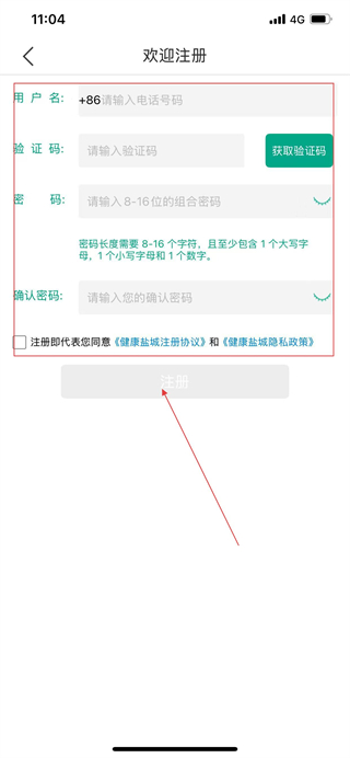 4、輸入手機(jī)號碼、驗證碼、密碼,勾選協(xié)議后點擊注冊。