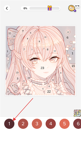 4、在填色界面底部點(diǎn)擊數(shù)字1,找到圖案中標(biāo)有1的區(qū)域,為其填充對應(yīng)顏色。