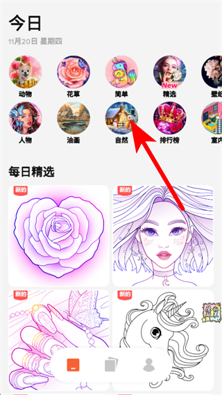 1、打開減壓填色繪畫書APP,選擇喜歡的分類如自然類,進(jìn)入分類頁面。