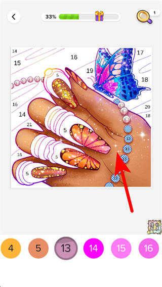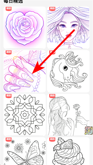 2、在分類頁面中,選擇一幅填色圖如每日精選中的美甲蝴蝶圖,進(jìn)入填色界面。
