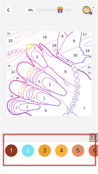 3、在填色界面,點(diǎn)擊下方的顏色數(shù)字如數(shù)字1、2等,然后填充畫面中對(duì)應(yīng)數(shù)字的區(qū)域。