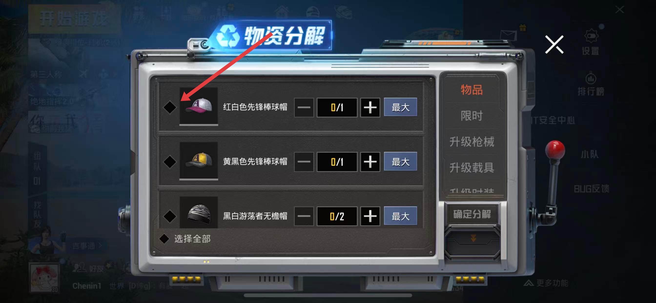 3、看到可以分解的物品列表,點擊物品左側(cè)的菱形選擇框,選擇想要分解的物品。