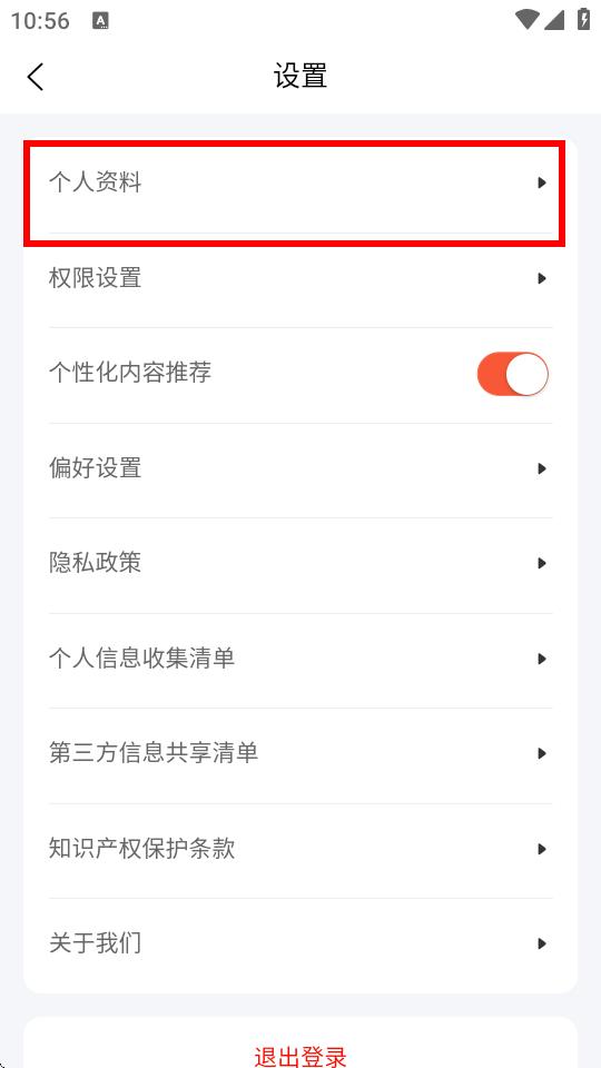 3、進(jìn)入設(shè)置頁(yè)面后,點(diǎn)擊個(gè)人資料。