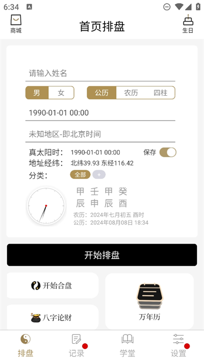 1、進入首頁后,可以通過輸入自己的基本信息進行個人排盤,查看排盤后的結(jié)果分析;
