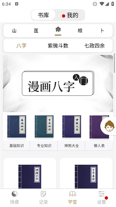 3、我們接著來看學堂,在學堂出可以看到有關八字相關的知識內(nèi)容,并進行分類可以輕松找尋書籍;