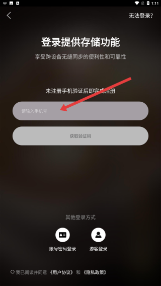 3、在登錄頁面輸入手機號碼,勾選協(xié)議后,可通過獲取驗證碼完成賬號登錄。