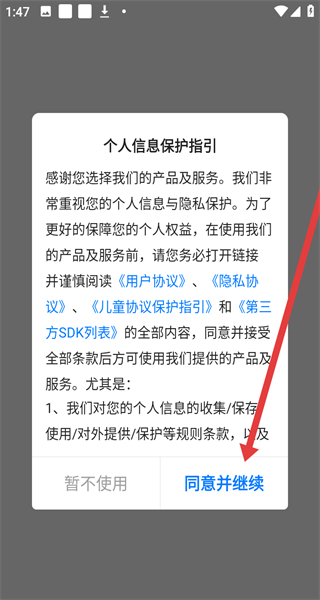 1、點(diǎn)擊“個(gè)人信息保護(hù)指引”彈窗的“同意并繼續(xù)”,進(jìn)入游戲APP首頁(yè)。