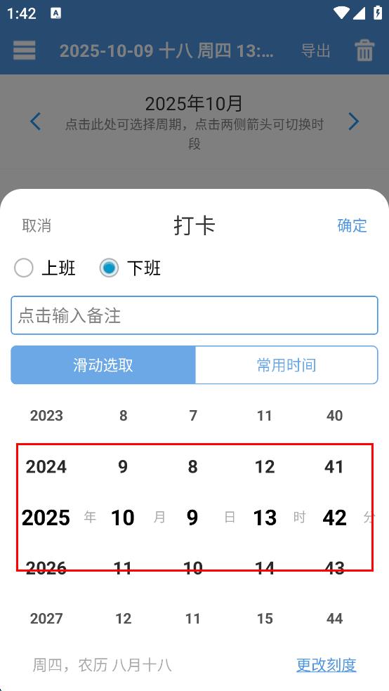 3、在打卡設(shè)置窗口,選擇上班或下班選項,輸入備注,滑動選取打卡時間。