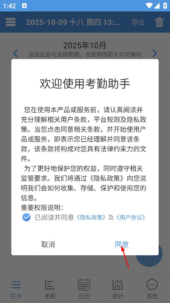 1、打開考勤助手應(yīng)用,在歡迎使用彈窗中,點擊同意按鈕,進入打卡界面。
