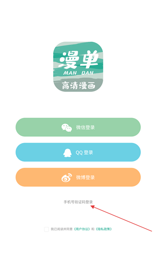 1、打開(kāi)漫單漫畫(huà)app,點(diǎn)擊下方手機(jī)號(hào)驗(yàn)證碼登錄的按鈕。