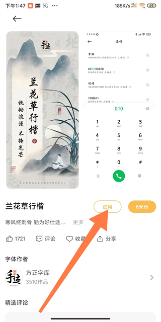 4、在字體詳情頁面,點(diǎn)擊試用或購買按鈕,即可完成字體樣式設(shè)置操作。