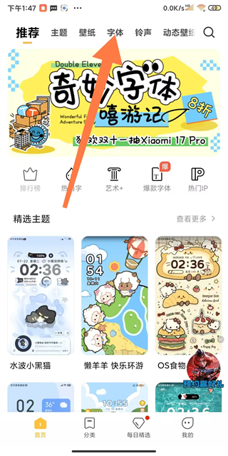 1、在小米桌面APP首頁,點(diǎn)擊上方字體選項(xiàng),進(jìn)入字體頁面。
