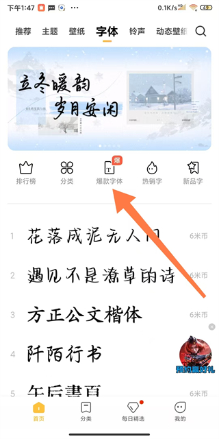 2、在字體頁面,點(diǎn)擊爆款字體選項(xiàng),進(jìn)入爆款字體列表界面。