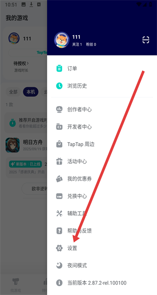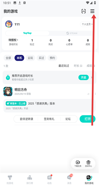 1、在TapTap“我的游戲”頁(yè)面點(diǎn)擊右上角菜單按鈕,進(jìn)入側(cè)邊欄菜單。