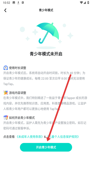 4、可以在青少年模式頁(yè)面中點(diǎn)擊“開(kāi)啟青少年模式”,按提示完成開(kāi)啟操作。