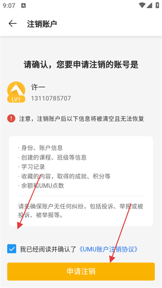 4、勾選我已經(jīng)閱讀并確認(rèn)了UMU賬戶注銷協(xié)議,點(diǎn)擊申請注銷即可。