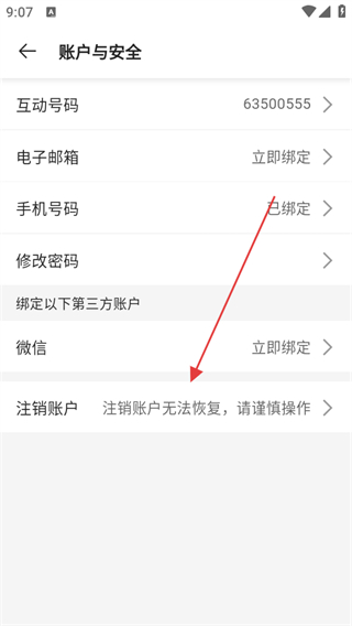 3、進(jìn)入賬戶與安全頁面后,點(diǎn)擊注銷賬戶選項(xiàng),注意注銷賬戶無法恢復(fù),需謹(jǐn)慎操作。