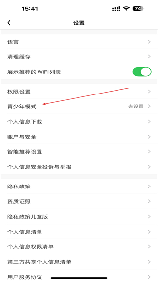 3、進入到設置的頁面內,點擊青少年模式的按鈕。