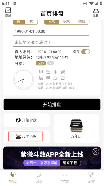 1、下載安裝好應(yīng)用后,進入首頁排盤往下劃就能看到【八字論財】了;