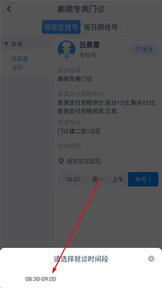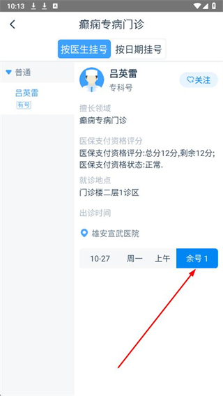 3、在癲癇專病門診頁面,選擇醫(yī)生,點擊余號。