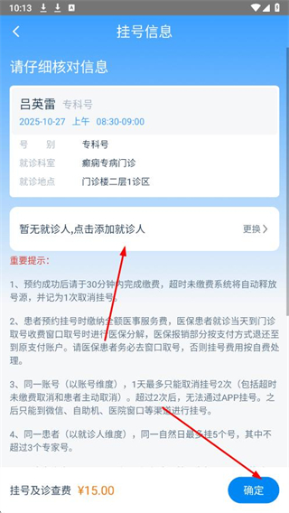 5、進入掛號信息頁面,添加就診人,點擊確定,完成掛號操作。