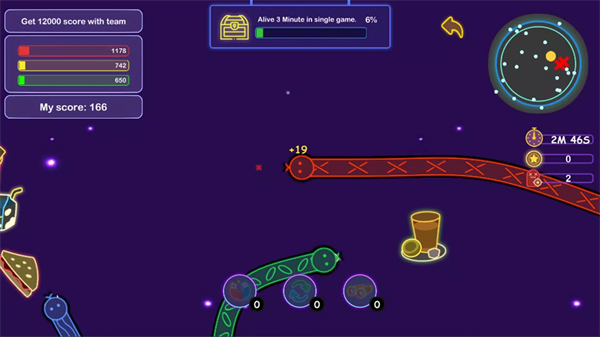 4、在開始階段,小蛇長(zhǎng)度很短,需要通過(guò)吞噬周圍的霓虹物體來(lái)快速成長(zhǎng);