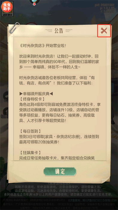 1、進(jìn)入到游戲界面之后,玩家將會(huì)看見(jiàn)一個(gè)關(guān)于游戲內(nèi)容的公告,玩家點(diǎn)擊右上角的叉號(hào)即可關(guān)閉;