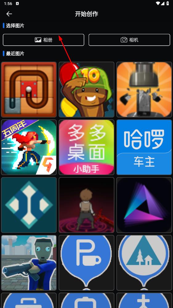 3、在開始創(chuàng)作頁面點擊“相冊”選項,可從相冊選擇圖片用于創(chuàng)作。