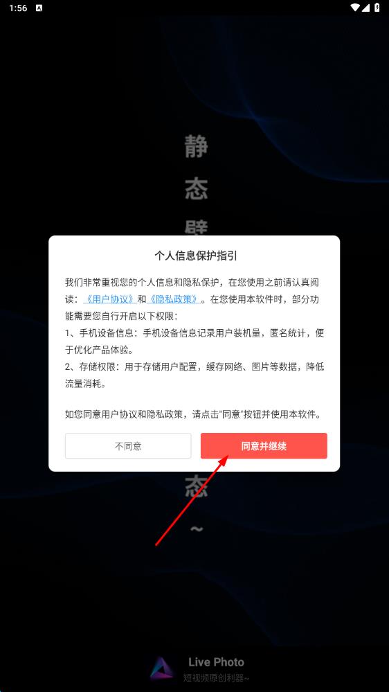 1、打開 Live Photo 軟件,出現(xiàn)個人信息保護指引彈窗,點擊“同意并繼續(xù)”按鈕,進入軟件主面。