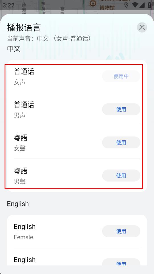 5、在播報語言頁面,選擇你想要的語音播報聲音,點擊使用即可完成更改。