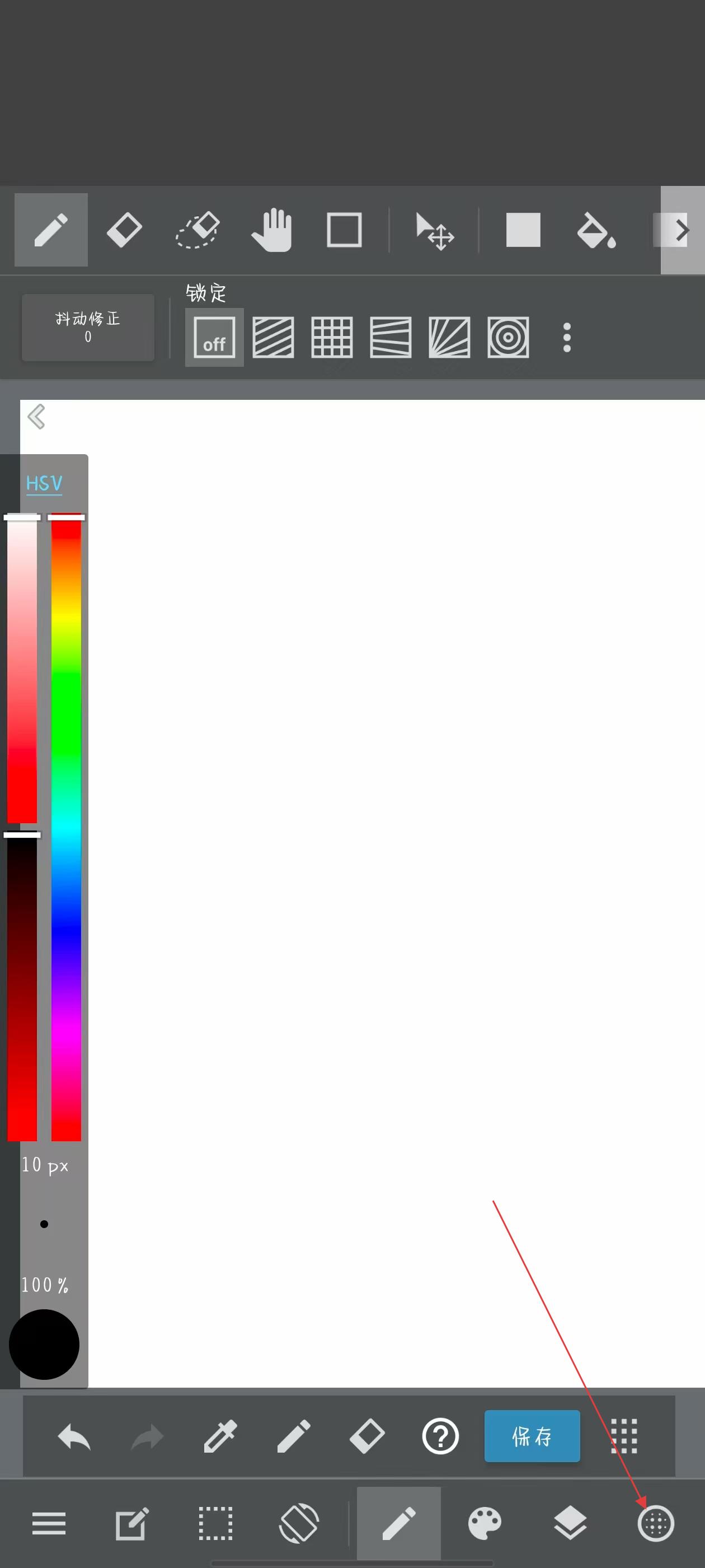 1、打開(kāi)Medibang Paint應(yīng)用,點(diǎn)擊底部工具欄最右側(cè)的圓點(diǎn)圖標(biāo)。