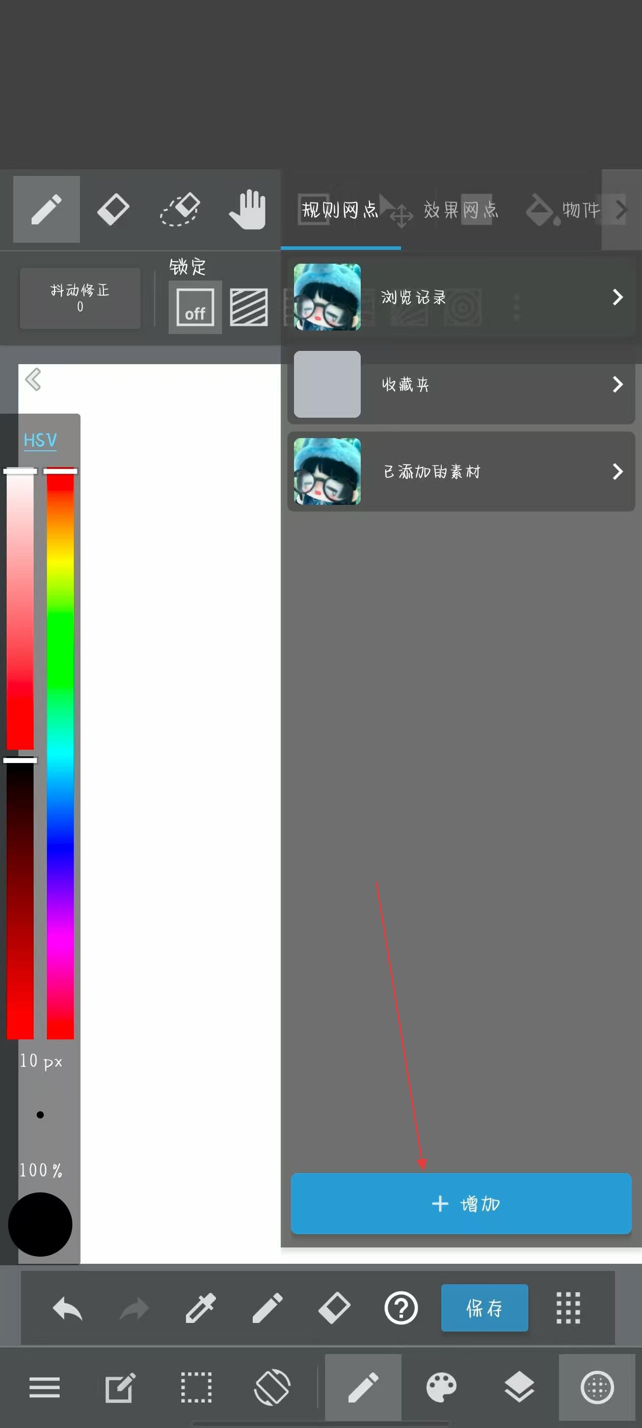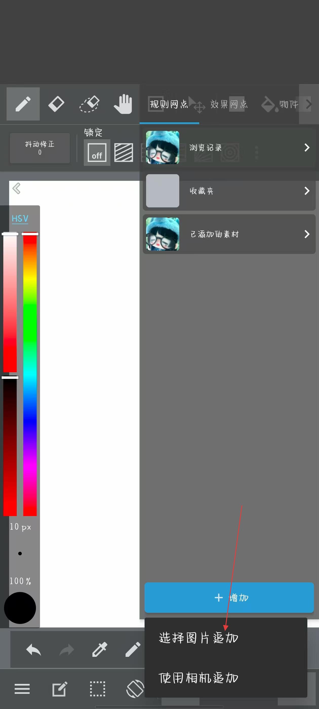 2、在彈出的素材面板中,點(diǎn)擊藍(lán)色+增加按鈕,展開(kāi)添加方式選項(xiàng)。