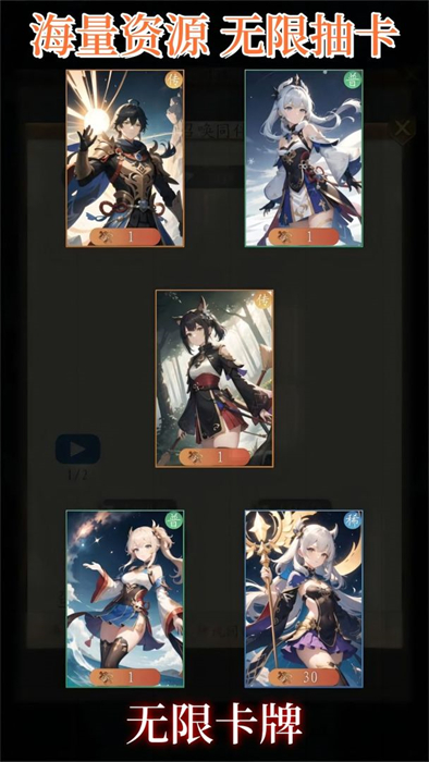 無限卡牌游戲是一款模擬抽卡主題的休閑益智小游戲,通過精美的卡牌畫面和多樣化的角色選擇,給玩家?guī)砹撕?jiǎn)單而又有趣的游戲體驗(yàn),玩家可以收集和升級(jí)卡牌,并通過簡(jiǎn)單易懂的游戲操作來展開精彩的戰(zhàn)斗,以此來享受其帶來的休閑快感,此外,玩家還可以挑戰(zhàn)各種不同的游戲模式,盡情展現(xiàn)自己的抽卡實(shí)力哦!