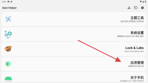 1、打開三星工具箱APP,在首頁(yè)內(nèi)向下滑動(dòng)找到并點(diǎn)擊應(yīng)用管理的按鈕。