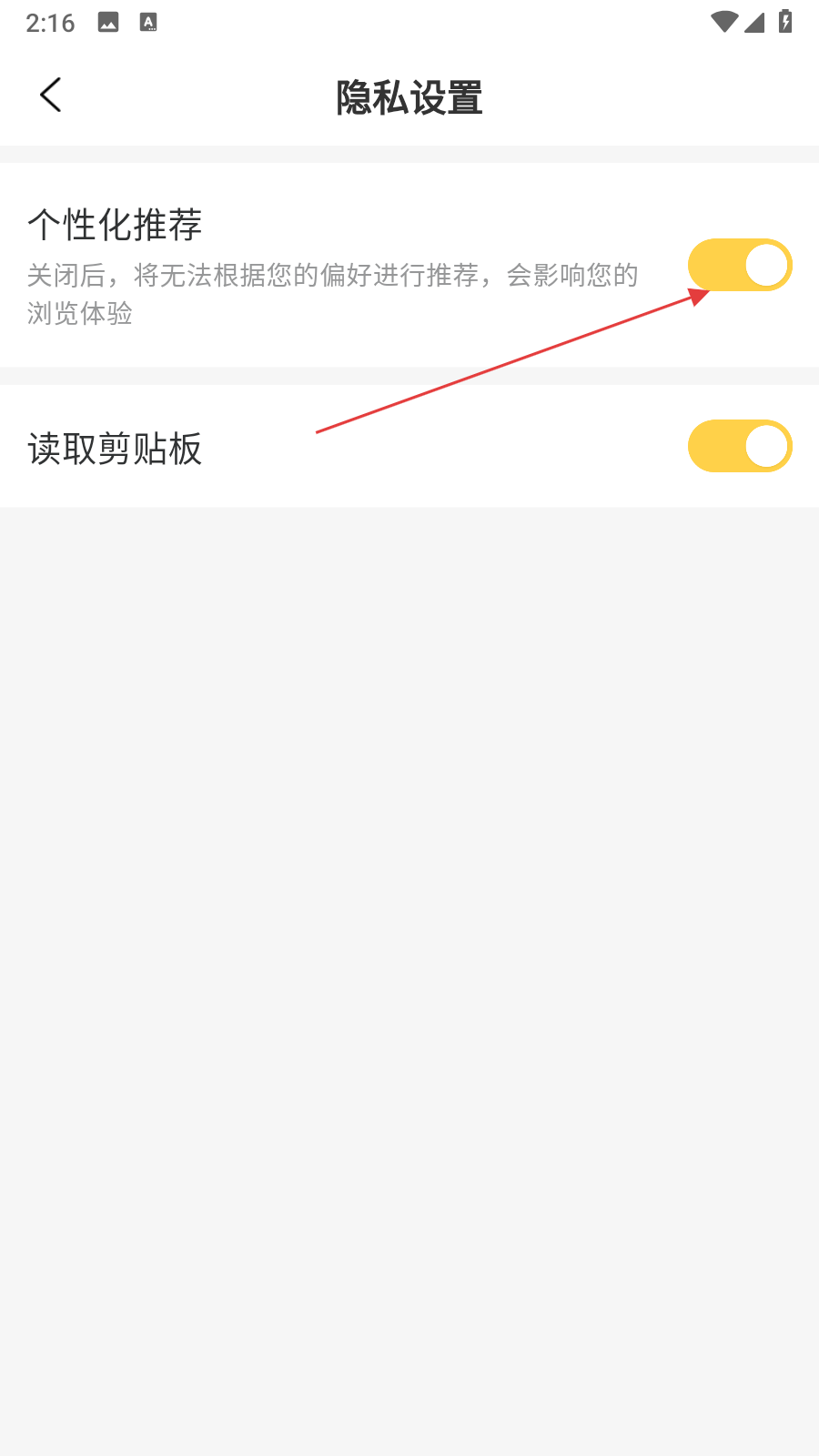 4、在隱私設(shè)置頁面,找到個(gè)性化推薦,點(diǎn)擊其右側(cè)的開關(guān)按鈕,即可關(guān)閉個(gè)性化推薦功能。