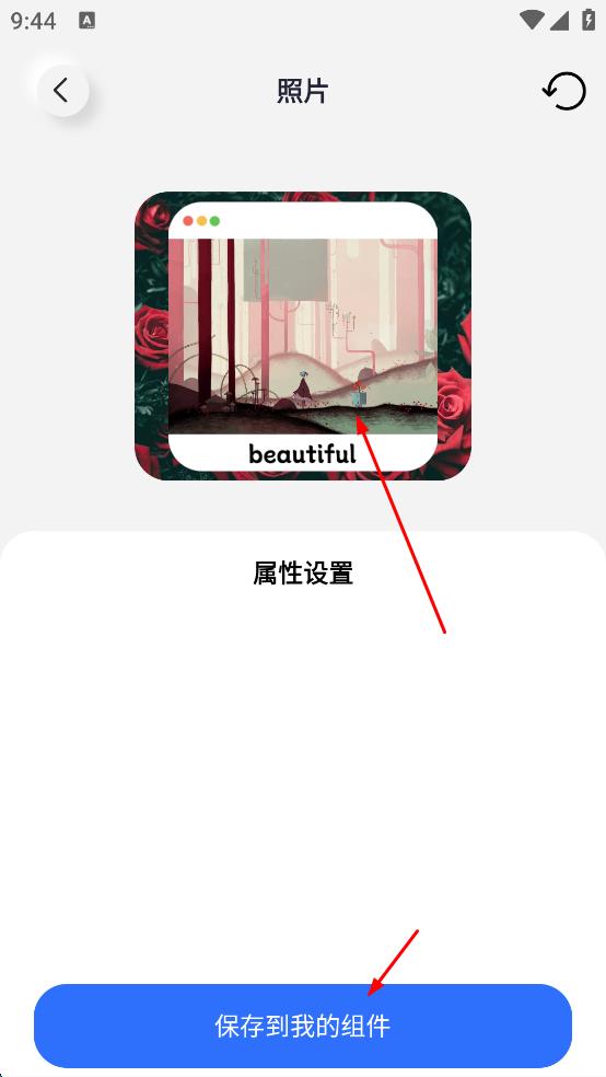 3、在照片詳情頁面,找到標(biāo)有“保存到我的組件”的藍(lán)色按鈕,點(diǎn)擊該按鈕,等待軟件完成保存操作,即可將這張照片保存到組件中。