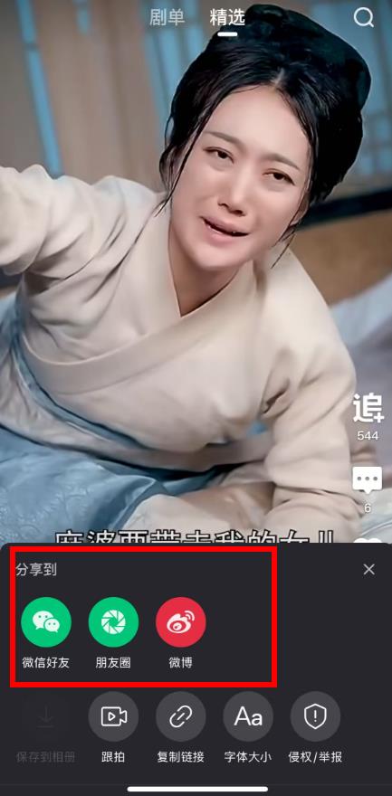 3、在彈出的分享選項(xiàng)中,選擇微信好友,朋友圈,微博等渠道,分享短劇內(nèi)容。