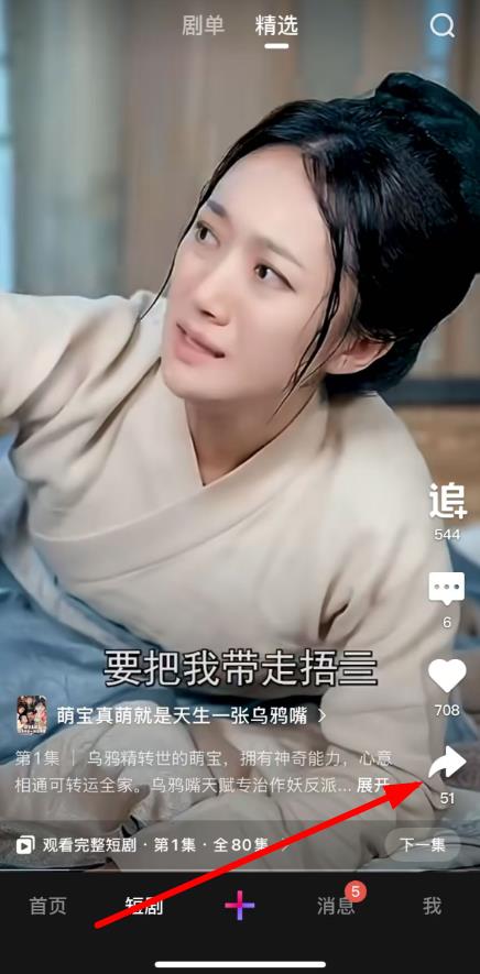 2、在短劇播放頁面,點(diǎn)擊右側(cè)的分享按鈕箭頭指向圖標(biāo)。