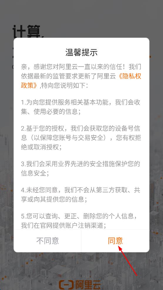 1、打開阿里云App,出現(xiàn)溫馨提示彈窗,閱讀后點擊同意按鈕。