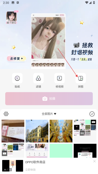1、打開日雜相機APP,在主界面點擊拼圖功能按鈕,進入拼圖準備環(huán)節(jié)。