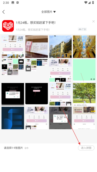 2、在圖片選擇界面,挑選1-9張需要拼圖的圖片,選好后點擊進入拼圖按鈕。