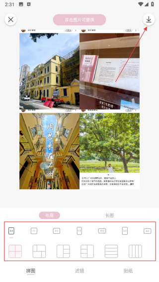 3、進入拼圖編輯界面,選擇心儀的拼圖布局樣式,也可添加濾鏡、貼紙等效果優(yōu)化拼圖,右上角是保存按鈕。
