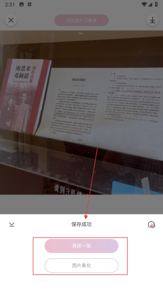 4、調整滿意后,點擊右上角的下載按鈕,將拼好的圖片保存到相冊,保存成功后可選擇再拼一張或圖片美化等操作。