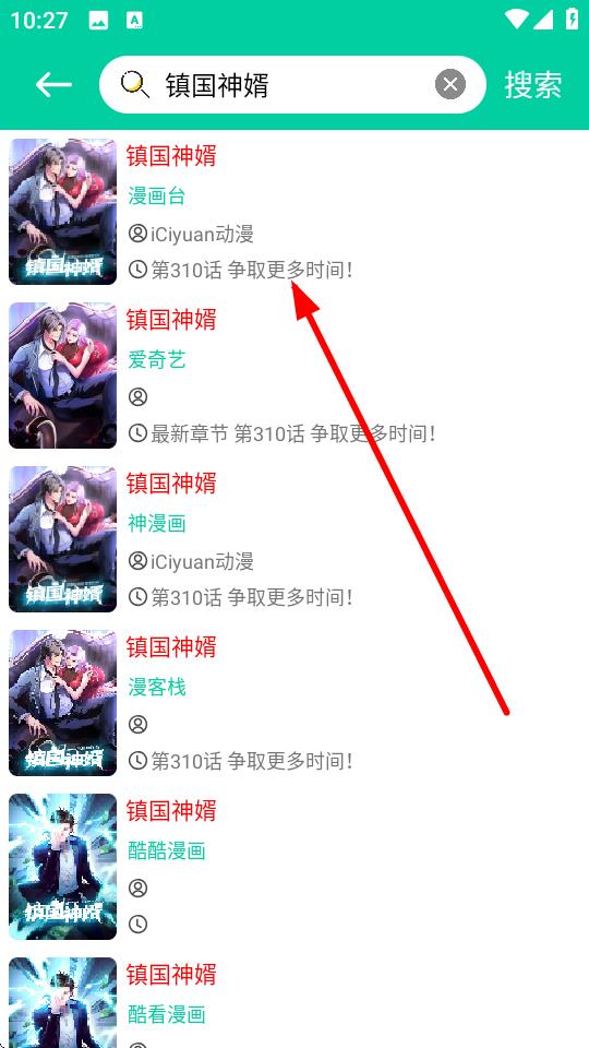 2、點擊該漫畫,進(jìn)入搜索結(jié)果頁,選擇一個漫畫源,比如帶有最新章節(jié)提示的來源。