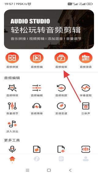 1、打開魔音音樂APP,在首頁(yè)內(nèi)點(diǎn)擊音頻提取的功能。