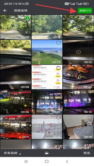 2、進(jìn)入到視頻選擇的界面內(nèi),選擇后點(diǎn)擊完成的按鈕。